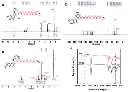 (a) 1H NMR spectra of VP, (b) 13C NMR spectra of VP, (c) 1H NMR spectrum of VPGE, and (d) FTIR spectra of VP and VPGE.