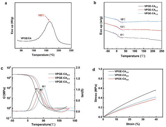In order to study the solvent resistance of the material, we soaked VPGE−CA1.0 in different organic solvents for 24 h, then took out the sample, absorbed the excess solvent with filter paper to weigh the mass, and calculated the swelling rate according to Equation (1). The samples were dried in a 100 °C oven until they reached a constant weight, and the gel content was calculated according to Equation (2). As shown in Figure 6d, the results showed that the gel content was above 90% in different solvents, indicating that the material had excellent solvent resistance. As shown in Figure 6e, the swelling rate is different in different solvents, and the medium polar organic solvents have a higher swelling rate except for water, which may be due to the presence of ester groups and unreacted complete hydroxyl groups in the polymer structure, which may cause the sample to swell in some polar solvents with similar miscibility. The absence of swelling in water indicates that the material is hydrophobic. In addition, the rate of swelling in polar solvents also varies, and it can be seen that the rate of swelling will be large in soluble organic solvents and slightly smaller in non−soluble organic solvents.