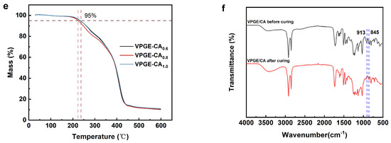 (a) DSC curves of VPGE−CA (R = 1.0, TBD 5 mol%), (b) DSC curves of VPGE−CA (R = 0.6, 0.8, 1.0, TBD 5 mol%), (c) storage modulus (left) and tan δ (right) of VPGE−CA networks (R = 0.6, 0.8, 1.0; TBD 5 mol %), (d) strain–stress curves of VPGE−CA networks (R = 0.6, 0.8, 1.0; TBD 5 mol %), (e) TGA curves of VPGE−CA networks (R = 0.6, 0.8, 1.0; TBD 5 mol %), and (f) FTIR spectra of VP−CA before curing and after curing.