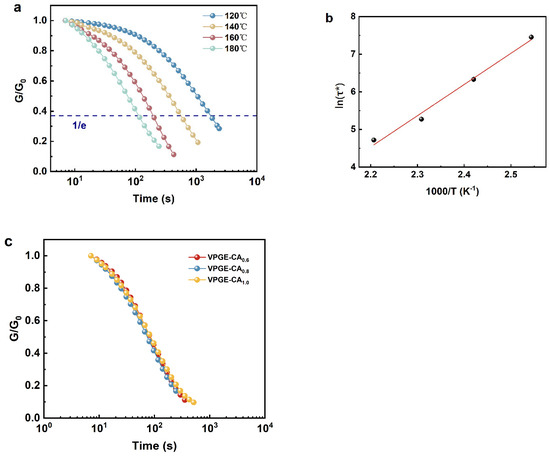 The ester bond in transesterification was a type of dynamic covalent bond, which allows for a transesterification reaction at high temperatures. As a result, the viscosity of the vitrimers showed a slow gradual process with the increase in temperature, and the transition process was controlled by the kinetics of the exchange reaction, which indicated the viscosity change law in accordance with the Arrhenius equation. The relaxation velocity in stress relaxation was usually used to characterize the reaction rate of dynamic bonds in a network [35,36]. Therefore, one of the most crucial characteristics used to describe the network’s rearrangement behavior was stress relaxation. The time it takes for the material stress (or modulus) to relax to 1/e (G/G0 = 1/e) is known as the relaxation time (τ∗). As seen in Figure 3a, the evolution of the relaxation modulus of the VPGE−CA vitrimer network (R = 1.0, TBD 5 mol%) was found at 120 °C, 140° C, 160 °C, and 180 °C, respectively. According to the stress relaxation curve obtained by the stress relaxation test, the relaxation time of the material was 1735 s at 120 °C, 556 s at 140 °C, 196 s at 160 °C, and 112 s at 180 °C. With the increase in temperature, the relaxation time was shortened from 1735 s at 120 °C to 112 s at 180 °C. The reason for this phenomenon is that the increase in temperature accelerated the transesterification reaction rate in the network and thus accelerated the rearrangement rate of the network, so that the relaxation time was significantly shortened. As seen in Figure 3b, we performed the Arrhenius curve for the relaxation time in Figure 3a. The Arrhenius equation is shown in Equation (4).