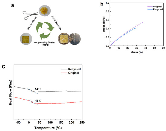 Due to the network rearrangement of vitrimers at high temperatures, the VPGE−CA1.0 system prepared can be physically recycled at 200 °C. As shown in Figure 5a, the sample was cut into small squares of about 3 mm × 3 mm × 1 mm, and then the sample fragments were evenly spread in the flat vulcanizer mold lined with PTFE film hot−pressed at 20 MPa and 200 °C for 20 min to obtain the sample after physical recovery. As shown in Figure 5b, the mechanical properties of the recovered samples were tested, and it was found that the mechanical stress and strain at break were reduced after recovery. This may be due to the fact that there are not many dynamic structural units in the network, and the network is not tightly connected to each other, resulting in a decrease in mechanical strength. As shown in Figure 5c, DSC tests were carried out on the recovered samples, and it was found that the recovered samples were not much different from the original samples in terms of thermal performance, indicating that the recovered samples had good thermal and recyclable performance.