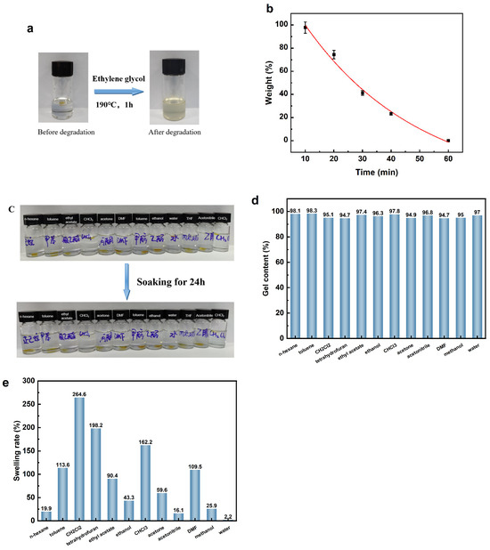 (a) Digital photograph of VPGE−CA1.0 degradation in ethylene glycol, (b) the curves of VPGE−CA1.0 degradation, (c) digital photograph of VPGE−CA1.0 soaked in different solvents, (d) gel content of VPGE−CA1.0 in different solvents, and (e) swelling rate of VPGE−CA1.0 in different solvents (see the bottle cap).