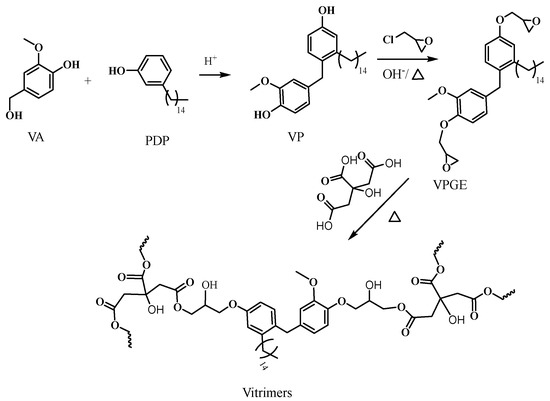 However, there are few reports on the vitrimers of natural phenols, and in this paper, we chose to synthesize a substance with two phenolic hydroxyl groups with cardanol and vanillyl alcohol and then solidified it with citric acid to prepare fully bio−based vitrimers with self−healing and reprocessing features. Cardanol is obtained from natural cashew nut shell oil as a raw material and is a green and environmentally friendly industrial raw material [32,33,34]. Vanillyl alcohol is an aromatic alcohol extracted from vanilla and gastrodia. Many kinds of fruits and vegetables, especially citrus fruits, contain high levels of citric acid, especially lemons and limes, which contain a lot of citric acid, which can reach 8% after drying. Since cardanol has only one phenolic hydroxyl group, inspired by Zhao and co−workers [31], as seen in Scheme 1, we selected 3−pentadecylphenol and vanillyl alcohol to design and synthesize a bisphenol compound (VP), and the VP was epoxidized to obtain epoxide (VPGE) and cured with citric acid in the presence of catalyst TBD. Since VP has only two phenolic hydroxyl groups, in order to enable the vitrimers to form a crosslinking network, we chose a substance with at least three carboxyl groups for curing when selecting an acid curing agent, and we chose citric acid for curing due to its low price. This work expands the applications of low−priced cashew phenols in vitrimer materials and provides a novel approach to prepare bio−based vitrimers with desirable properties. The structures of cardanol−derived VP and VPGE were characterized by nuclear magnetic resonance. The curing reactivity of VPGE was measured by differential scanning calorimetry (DSC). Additionally, the network rearrangement properties of cardanol−derived vitrimers were investigated by dynamic mechanical analysis (DMA).