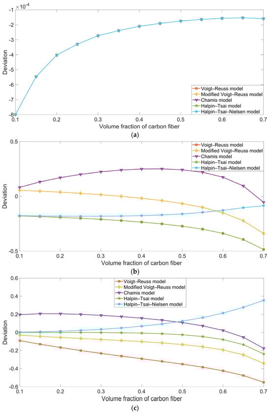 Figure 7 indicates that, for different properties, the deviations for the various ROM models were not the same. For the longitudinal Young’s modulus Exx, the deviation for each ROM model was almost the same, as is consistent with the results shown in Figure 2. Similarly, for the longitudinal thermal expansion coefficient αxx, the deviation for the Voigt–Reuss model was almost the same as that for the Chamis model. However, for the transversal Young’s modulus Eyy, the in-plane shear modulus Gxy, and the transversal thermal expansion coefficient αyy, the corresponding ROM models with the minimum deviation were the modified Voigt–Reuss model, the Halpin–Tsai model, and the Voigt–Reuss model, respectively. Furthermore, we found that the deviation was also affected by the volume fraction of the carbon fiber Vfc. Taking the relative deviation for the transversal Young’s modulus Eyy in Figure 7b, for example, the modified Voigt–Reuss model obtained higher prediction accuracy when the Vfc was smaller than 0.6, and the thermotical data obtained using the Halpin–Tsai–Nielsen model were closer to the simulation results when the Vfc was larger than 0.6. Analogously, regarding the deviation for the in-plane shear modulus Gxy in Figure 7c, the Halpin–Tsai model achieved higher prediction accuracy with a smaller Vfc value, and the Chamis model achieved better accuracy with a larger Vfc. Thus, each ROM model is suitable for a particular scenario, and the appropriate ROM model should be selected to study the various properties of carbon-fiber-reinforced rubber.