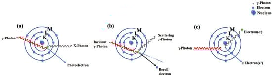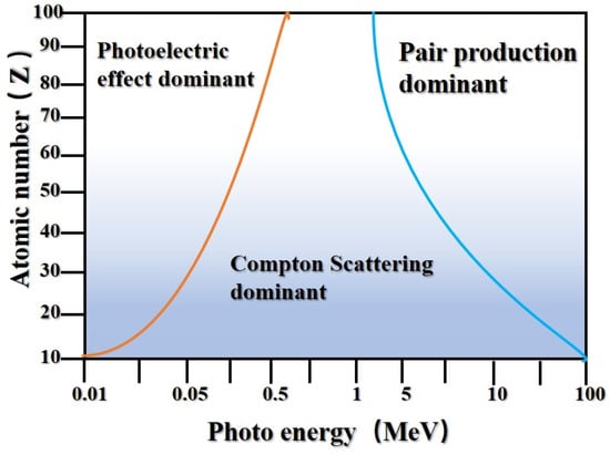 Gamma rays are primarily attenuated and absorbed through the photoelectric effect with atoms, Compton scattering, and pair production []. The photoelectric effect manifests in two principal forms: ① γ-photons impart all their energy to extranuclear electrons, resulting in their emission from atoms as Auger electrons; ② γ-photons interact with atomic nuclei, placing atoms in an excited state. Subsequent transitions of outer electrons to internal vacancies are marked by the emission of characteristic X-rays. The probability of the photoelectric effect occurring is primarily influenced by the incident photon energy, the material’s density, and its atomic number []. Compton scattering is characterized by the inelastic interaction between photons of specific energy and loosely bound extranuclear electrons, which transfers a portion of the energy to electrons, leading to a decrease in photon energy, an increase in wavelength, and deflection from the incident direction at a specific angle. The electron-positron pair production effect commonly occurs during the interaction of high-energy gamma photons with atomic nuclei, under the influence of the nuclear electrostatic force, an incident gamma photon is converted into a pair of electron and positron. Ultimately, these pairs are annihilated, producing two photons of identical energy but moving in opposite directions. Figure 1 provides a schematic representation of the interaction between gamma rays and matter. Additionally, γ-rays can also undergo coherent scattering with atomic nuclei and be shielded. Generally, the energy of γ-rays is higher than the binding energy of electrons. Under the influence of the electric field of extranuclear electrons, the wavelength of γ-rays remains unchanged, and they are scattered out at a certain angle from the initial direction. Unlike the photoelectric effect and Compton scattering, low-energy gamma rays are more likely to undergo coherent scattering with high-atomic number elements, resulting in attenuation [].