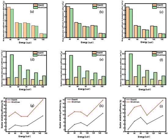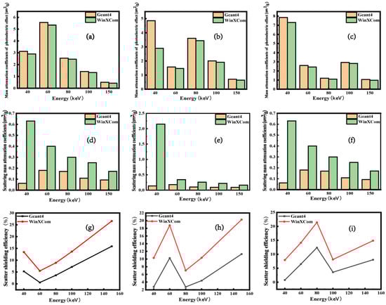 Mass attenuation coefficients due to photoelectric absorption (a–c), mass attenuation coefficients from scattering (d–f), and scattering efficiencies (g–i) of composites with mixed components in ratios of 3/5/2, 5/3/2, and 7/2/1, as computed using Geant4 and WinXCom.
