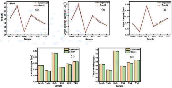 Figure 7a presents the shielding efficiency metrics for materials comprising varied constituents. The divergence between the experimental and calculated values remains within 1.63%. Considering that the 80 keV energy spectrum aligns with bismuth’s absorption blind spot [], composite materials doped with bismuth oxide exhibit suboptimal shielding properties. However, the incorporation of multiple components into the composite material enhanced its shielding capabilities to some extent. Figure 7b–e respectively illustrate the linear attenuation coefficients, mean free path values, half-value layers, and tenth-value layers for materials of varying compositions. The results indicate that composite materials doped with tantalum pentoxide exhibit the best shielding performance, with values calculated by Geant4 aligning closely with experimental test data.