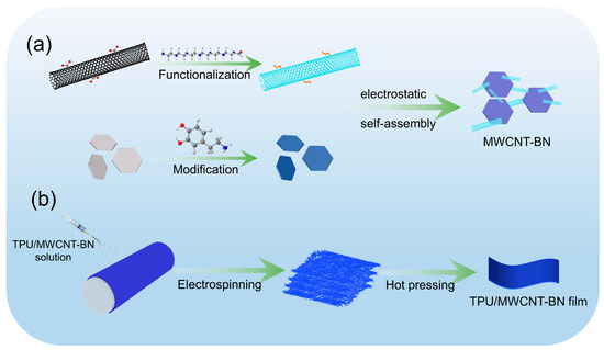 (a) Schematic illustration of fabrication for (a) hetero-structured MWCNT−BN fillers and (b) thermally conductive TPU/MWCNT−BN composite films.