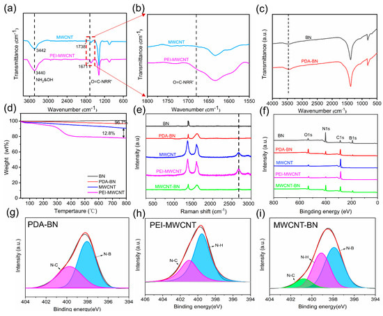 (a,b) FT-IR spectra of MWCNT and PEI−MWCNT. (c) FT-IR spectra of BN and PDA−BN. (d) TGA spectra of BN, PDA−BN, MWCNT, and PEI−MWCNT. (e) Raman results of BN, PDA−BN, MWCNT, PEI−MWCNT, and MWCNT-BN. (f) XPS patterns of BN, PDA-BN, MWCNT, PEI−MWCNT, and MWCNT−BN. (g–i) N1s XPS core level of PDA−BN, PEI−MWCNT, and MWCNT−BN.