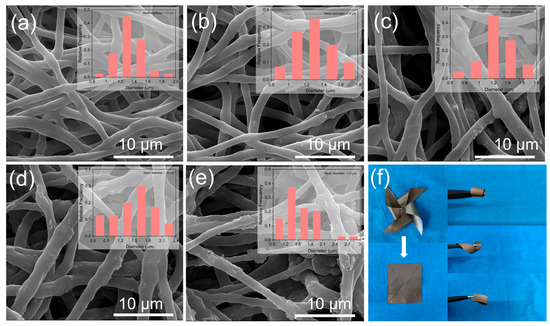 (a–e) SEM images of TPU/MWCNT-BN fibers with different filler content of 0 wt%,10 wt%, 20 wt%, 30 wt%, and 40 wt%. The insets in (a–e) represent the diameter distribution of fibers. (f) Photographs of the TPU/MWCNT-BN composite films.