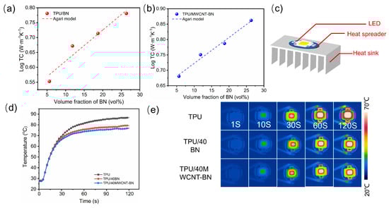 Agari model fitting curve of composite films: (a) TPU/BN and (b) TPU/MWCNT−BN. (c) Schematic illustration of the thermal conduction in an LED bulb. (d) Surface temperature versus time of the LED chip when TPU, TPU/40BN, and TPU/40MWCNT−BN as a heat spreader between LED chips and the heat sink and (e) corresponding IR images.