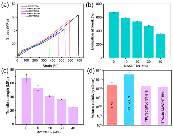 (a) Tensile stress–strain curves of the TPU film and TPU/MWCNT-BN composite films. (b) Elongation at break and (c) tensile strength of TPU/MWCNT-BN composite films. (d) Volume resistivity of TPU, TPU/BN, and TPU/MWCNT-BN composite films.