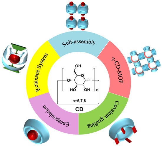 Supramolecular assembly usually involves non-covalent interactions such as hydrogen bonding, van der Waals forces, and π-π stacking between molecules, enabling host and guest molecules to form stable structures with specific shapes and functionalities under appropriate conditions []. The supramolecular assembly has been used as an efficient strategy for the construction of CPL materials. For example, cyclodextrins (CDs) are natural macrocyclic structures formed by linking six, seven, or eight D-glucose molecules via α-1,4 glycosidic bonds, called α-, β-, and γ-CD, respectively, which feature a hydrophobic inner cavity and hydrophilic outer surface and have the ability to form inclusion complexes with numerous organic and inorganic compounds, thereby bringing about diverse assemblies with specific properties and functions []. With the extensive applications in the fields of chemistry and biology, CDs hold significant potential for a wide range of industrial applications [,,].