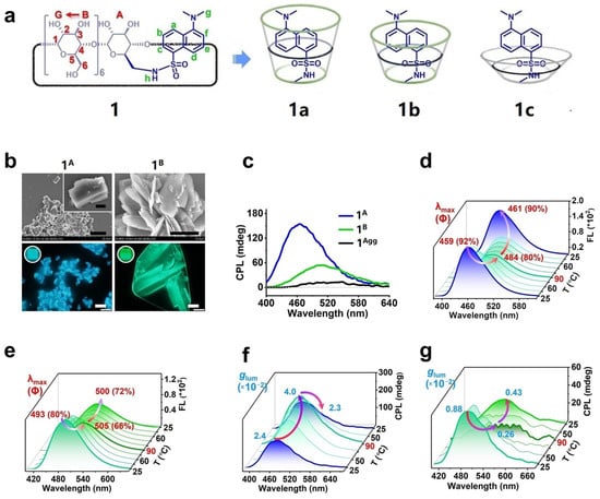 (a) Structures of 1a–1c; (b) SEM and fluorescence images of 1A and 1B; (c) CPL spectra of 1A, 1B, and 1Agg; (d,e) temperature-dependent FL spectra of 1A and 1B; (f,g) temperature-dependent glum and CPL emission spectra of 1A and 1B [].