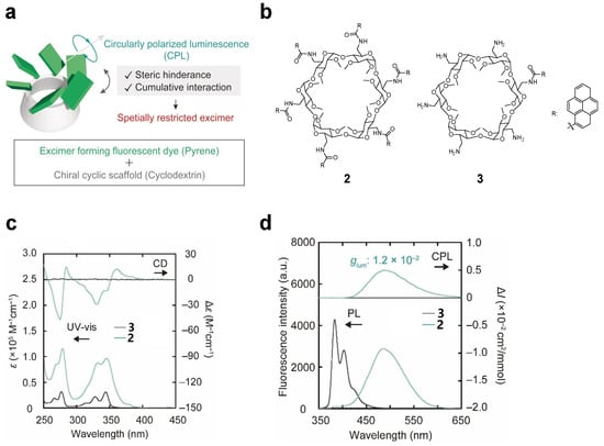 (a) CPL emission from pyrene-modified α-CD scaffold; (b) chemical structures of 2 and 3; (c) circular dichroism (top) and UV-vis absorption spectra (bottom) of 2 and 3; (d) CPL (top) and FL (bottom) spectra of 2 and 3 [].