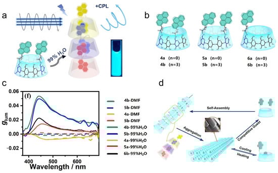 Yang et al. [] further demonstrate that pyrene-modified γ-CD derivatives 4–6 (Figure 4a,b) can aggregate to nanostructures in water, where the pyrene units are well confined within the enclosed chiral cavity of γ-CD (Figure 4d). The host–guest complexes exhibit a significant CPL signal, with a maximum glum = 5.3 × 10−2 (Figure 4c).