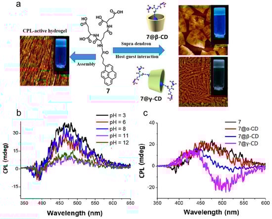 Duan et al. [] report dendritic hydrogel 7, which can self-assemble into a helical nanofiber (Figure 5a). Additionally, 7 is capable of interacting with CDs through host–guest recognition, forming supramolecular structures with CPL emission. To some extent, the CPL signal of hydrogel 7 decreases with increasing pH values and the maximum glum is 6.87 × 10−3 at pH = 3 (Figure 5b). Due to the significant reduction in strong π-π stacking of the pyrene groups caused by the encapsulation between 7 and β-CD, the CPL emission of 7@β-CD shows a blue shift. Furthermore, the formation of a 2:1 complex of 7@γ-CD leads to a significant enhancement in CPL emission centered at 480 nm. However, no interaction is observed between 7 and α-CD (Figure 5c).