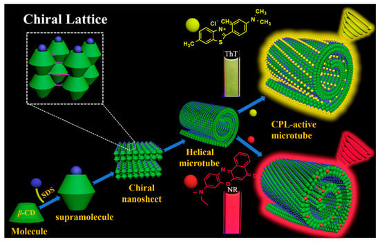 Subsequently, Duan et al. [] discover that β-CD and sodium dodecyl sulfate (SDS) can assemble into chiral nanosheets, which further self-assembles into helical microtubes through intermolecular hydrogen bonding (Figure 6). Due to the chiral transfer of β-CD, the microtubes loaded with dyes exhibit chirality and CPL emission. Notably, the helical microtube doped with ThT shows the strongest CPL emission with glum = ±0.1.
