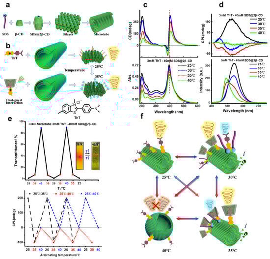 (a) Self-assembly of SDS@2β-CD; (b) reversal of CPL emission of non-chiral dye ThT with SDS@2β-CD from 25 °C to 35 °C; (c) circular dichroism (top) and UV-vis absorption (bottom) spectra of ThT-SDS@2β-CD at different temperatures; (d) CPL (top) and FL (bottom) spectra of ThT-SDS@2β-CD at different temperatures; (e) top—variation in the transmittance of the ThT-SDS@2β-CD at 650 nm with varying temperature; bottom—switchable CPL inversion cycles (at 590 nm) of 3 mM ThT/40 mM SDS@2β-CD suspension by alternately changing temperature; (f) schematic representation of CPL switching modes of ThT-SDS@2β-CD at different temperatures [].