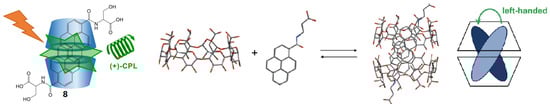 Takashima et al. [] prepare a series of complexes exhibiting CPL emission concentrated at 480 nm, composed of γ-CD and hydrophobic pyrene derivatives. Among them, complex 8 shows the highest glum (+2.2 × 10−3) and 0.6 (Figure 8). They propose that the hydroxyl group of serine forms hydrogen bonds with γ-CD, inducing two pyrenyl groups to twist into a stable chiral excimer.