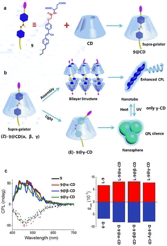 Liu et al. [] incorporate cyanostilbene-conjugated gelator 9 into CDs to result in extensive CPL emission (Figure 9a). The assemblies show a slight increase in glum compared to 9 individually (Figure 9c). Particularly, due to the large cavity of γ-CD, the gelator 9 can undergo Z-E isomerization. At this point, the assembly can form into a nanosphere, and CPL emission becomes silenced. Heating the system causes the assembly to transform into a nanotube; in this case, the complex exhibits CPL emission again (Figure 9b).