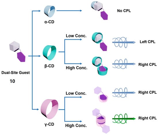 After that, Liu et al. [] synthesize novel non-chiral guest molecule 10, featuring a conjugated connection between pyrene and adamantane. With dual host–guest interaction sites, compound 10 serves as a platform for exploring different CD-induced CPL emissions (Figure 10). Due to the differences in the volume of the pyrene and adamantane groups, as well as their affinity for the CD cavity, different types of CDs can selectively encapsulate the two parts of guest 10, thereby resulting in different CPL emissions. As anticipated, α-CD is too small to accommodate any portion of 10, thus precluding CPL emission. At low concentrations, β-CD captures the adamantane moiety selectively, with pyrene encapsulation occurring as the concentration increases, leading to opposite CPL emission. On the other hand, γ-CD exclusively recognizes the pyrene moiety, thereby adhering to the H-K rule, with the CPL emission remaining unaltered. However, its encapsulation behavior of 10 varies at different concentrations.