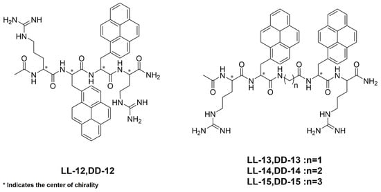 Kitamatsu et al. [] disclose that incorporating γ-CD into chiral bipyrenyl oligopeptides containing stereocenters of the same chirality can control the wavelength, intensity, and signal of stimulated supramolecular CPL. After adding γ-CD, LL-12 to LL-15 exhibit CPL emission in their photo-excited state (Figure 12 and Table 1). Upon the addition of γ-CD, the emission positions of CPL signals from LL-12 to LL-14 have no obvious change, but there is a larger blue-shift observed for LL-15. While CPL emission remains relatively stable for LL-13/γ-CD, significant increases are observed for both LL-12/γ-CD and LL-14/γ-CD. Additionally, LL-15/γ-CD undergoes a transition. In general, the glum values of LL-12/γ-CD to LL-15/γ-CD are either close to or slightly higher than those of LL-12 to LL-15, with LL-14/γ-CD showing a significant increase. However, there is no change in the inclusion behavior of another chiral oligopeptide with bipyrenyl groups in γ-CD. The supramolecular CPL emission regions for DD-12 to DD-14 remain unchanged. In contrast, DD-15/γ-CD exhibits the CPL signals in two distinct bands at 434 and 497 nm, attributed to differences in the pyrene overlap. The CPL emission sharply decreases for DD-13/γ-CD and DD-15/γ-CD, while it is increased for DD-12/γ-CD and DD-14/γ-CD, and DD-15/γ-CD undergoes a transition. The glum values of DD-12/γ-CD and DD-15/γ-CD slightly increase, with DD-14/γ-CD displaying a significant increase compared to itself, respectively.
