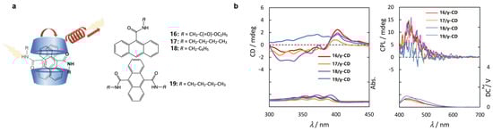 Takashima et al. [] develop a series of host–guest systems (16/γ-CD to 19/γ-CD) with high QY in the solid state and CPL emission. From 16/γ-CD to 18/γ-CD, the 9-position-substituted anthracene segments can interact with the γ-CD cavity, inducing a right-handed chiral distortion (Figure 13a). Consequently, left-handed CPL emission is observed. However, due to the presence of a single-molecule inclusion entity in 19/γ-CD, its CPL emission is weak (Figure 13b).
