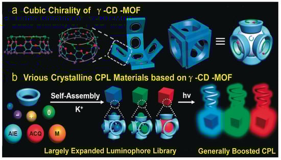 (a) Illustration of the cubic chirality of γ-CD-MOF; (b) various crystalline CPL materials based on γ-CD-MOF and non-chiral emitters with enhanced CPL [].