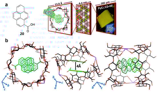 (a) Chemical structure of 1-pyrene carboxylic acid 20 and schematic representation of CPL emission for 20/γ-CD-HF; (b) solid-state X-ray diffraction of 20/γ-CD-HF [].