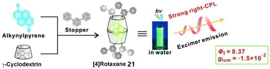 - Inouye, M.; Hayashi, K.; Yonenaga, Y.; Itou, T.; Fujimoto, K.; Uchida, T.-A.; Iwamura, M.; Nozaki, K. A Doubly Alkynylpyrene-Threaded [4]Rotaxane That Exhibits Strong Circularly Polarized Luminescence from the Spatially Restricted Excimer. Angew. Chem. Int. Ed. 2014, 53, 14392–14396. [Google Scholar] [CrossRef] [PubMed]