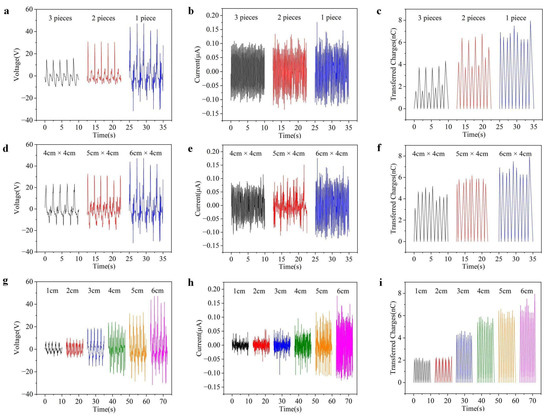 (a–c) The impact of the number of units on the electrical performance of the BWS, including (a) output voltage, (b) current, and (c) transferred charges. (d–f) The impact of the area on the BWS unit electrical performance, including (d) output voltage, (e) current, and (f) transferred charges. (g–i) The impact of the sliding distance on the electrical performance of the BWS unit, including (g) output voltage, (h) current, and (i) transferred charges.