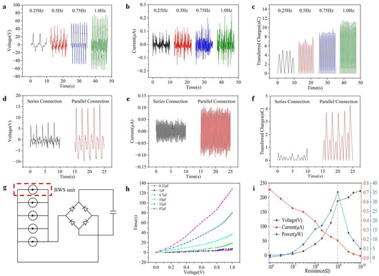 The breathing rate varies among different people, and the respiratory rate is usually lower than 1 Hz. In this study, the effect of the breathing rate on the output of the BWS unit is investigated by varying the sliding frequency between 0.25 Hz and 1 Hz. Figure 3a–c illustrate the changes in the output voltage, current, and transferred charge of the BWS unit as a function of different sliding frequencies. It can be observed that the output voltage gradually increases with sliding frequency varying from 0.25 to 1 Hz. With respect to the current and transferred charge, they show an upward trend with the increase in sliding frequency. This can be explained by the increase in power generation cycles originating from frequency changes.