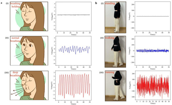 (a-I) The schematic diagram and output voltage of cessation of breathing. (a-II) The schematic diagram and output voltage of normal breathing. (a-III) The schematic diagram and output voltage of deep breathing. (b-I) The photograph of standing with the BWS and output voltage measured in a standing posture. (b-II) The photograph of walking with the BWS and output voltage measured in a walking posture. (b-III) The photograph of running with the BWS and output voltage measured in a running posture.