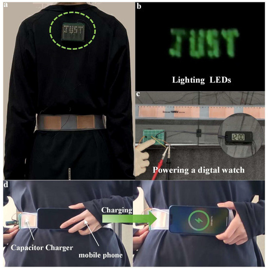 The energy-harvesting abilities of wearable sensors can be used for establishing a self-powered system that sustainably drives wearable electronic products. To demonstrate this, the developed BWS worn by an experimenter is directly connected to the LED pattern “JUST” that consists of 30 LED lights without a capacitor, as shown in Figure 5a,b and Video S1. It can be observed that the LED pattern “JUST” is simultaneously illuminated once the experimenter starts to exercise. In addition, the energy generated by the proposed BWS is stored in a 10 μF capacitor and then utilized to power a digital watch, as shown in Figure 5c and Video S2. Eventually, we demonstrate the applicability of the developed BWS by collecting the energy generated from daily physical activities to charge a 1 F super capacitor, followed by successfully powering an Apple smartphone, as shown in Figure 5d and Video S3.