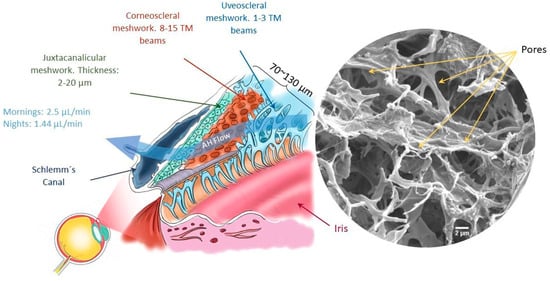 The human trabecular meshwork (HTM) is a tiny porous tissue responsible for intraocular pressure (IOP) regulation. IOP builds up mainly in response to resistance provided throughout the HTM to the aqueous humor (AH) outflow [1]. The HTM is made up of connective tissue containing collagenous and elastic fibers, and it is covered by flat cells [2]. This permeable tissue is located around the cornea and is composed of three different layers: the uveoscleral region (UVM), with pore sizes varying from 70 to 100 µm; the corneoscleral region (CTM), with pore sizes of 30 µm; and the juxtacanalicular region (JTC), with pore sizes of 4–7 µm (Figure 1) [3]. The pores are formed by cells and the extracellular matrix (ECM), organized in lamellar beams with a thickness of 5–12 µm [1]. The HTM, with a reported full thickness of 70–130 µm, and with CTM as the main compartment, also includes the UVM region, encompassing constructs of 40.6 ± 10.0 µm thickness [4], and the JCT region, with elements 2–20 µm thick [4]; it offers increasing resistance to fluid outflow across the varying thicknesses in the direction of the eye’s surface (from the inner to outer parts) as its porosity decreases [1]. Changes in the physical properties of the HTM, such as increases in stiffness (from 4 kPa in healthy tissue to 80 kPa in glaucomatous tissue) [4,5], alterations in ECM protein expression, or loss in cellular reparative capacity, can decrease the overall porosity of the HTM, resulting in AH outflow difficulties, a condition closely related to glaucoma [1,2].