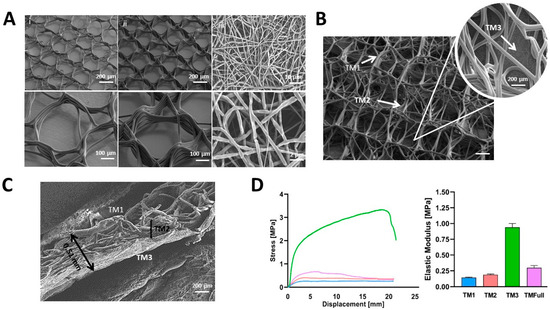 The stress–strain curves from the uniaxial tensile test of the scaffolds are shown in Figure 2D. The curves display an initial linear region with a steep slope, followed by a plateau region. Except for the TM3 electrospun scaffolds, which reached their breaking point at 100% elongation, the remaining structures did not break below 200% elongation. The tensile modulus for all the designs ranged from 0.14 to 0.94 MPa (Table 1), consistent with previously observed values for MEW PCL-based scaffolds, which reach a range of a few MPa [19,40]. The moduli of TM1, TM2, and TMFull were similar, with the highest modulus found in the TM3 nanofibrous scaffold, likely due to its lower porosity and greater number of fibers. In MEW scaffolds (TM1 and TM2), failure occurred in consecutive single fibers, whereas in the nanofibrous scaffolds (TM3), breakage was more abrupt.