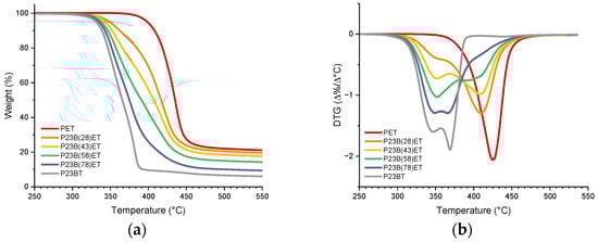 (a) TGA thermogram of PET, P23BT, and P23BET copolymers; (b) derivative curve (DTG).