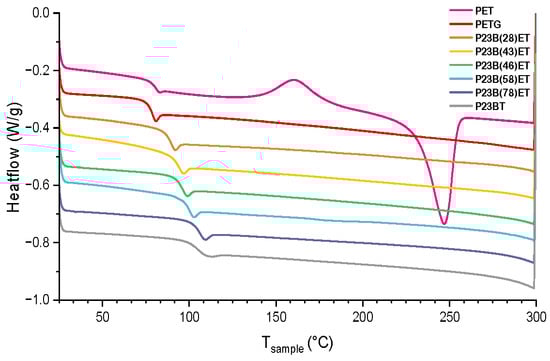 The DSC curve of the second heating of PET, PETG, P23BT, and P23BET copolymers. (The complete differential thermograms of the first and second heating cycles are shown in Figures S1–S3).