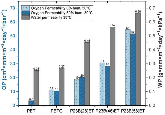 Water permeability measured at 38 °C, oxygen permeability measured at 30 °C, and both 0% and 50% humidity for PETG and P23BET; PET results are based on work previously published by our group (RamaPET N180, 10% crystallinity, not biaxially oriented) [].
