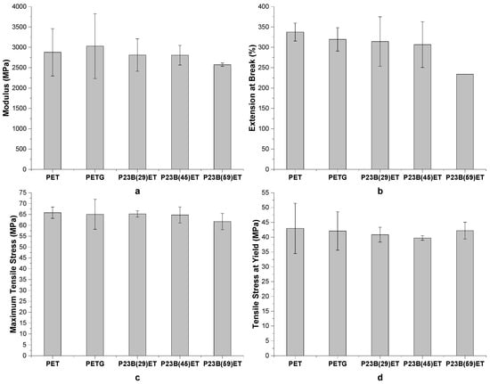 Tensile test results: (a) Young’s modulus; (b) extension at break in %, of P23B(59)ET, and two samples broke almost instantly and were excluded, having elongation at break percentages of 7.6 and 10.1; (c) maximum tensile stress; and (d) tensile stress at yield.