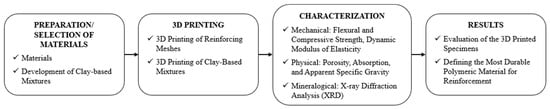 Figure 1 illustrates the flowchart of the present study and essentially the methodology followed for developing clay-based mixtures for 3D printing applications and their assessment. Section 2 of this study presents the materials and methods, explaining the methodology and equipment used to develop and assess clay-based mixtures and utilize them through LDM 3D printing. Section 3 showcases the results concerning the chemical composition of the mixtures, characterization results of the printed prisms, and the resulting mechanical properties. The study concludes with Section 4, which provides a brief summary of the methodology and results.