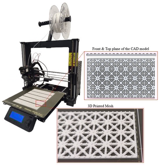To determine the most suitable material in terms of mechanical properties and adhesion between layers of the clay-based mortar, three widely used materials in FFF technologies were selected: PLA, PETG, and ABS. All materials were provided in filament form with a diameter of 1.75 mm. More specifically, the filaments used are eSUN PLA+ (Shenzhen, China), eSUN PETG (Shenzhen, China), and Spectrum Smart ABS (Pęcice, Poland). The printing parameters were defined, with the nozzle temperature set at 215 °C for PLA, 240 °C for PETG, and 255 °C for ABS. Bed temperatures were set at 60 °C for PLA, 90 °C for PETG, and 110 °C for ABS. All meshes were printed using a 0.4 mm nozzle and 0.2 mm layer height, with a fill density of 100% using a rectilinear fill pattern. Figure 4 demonstrates the FFF 3D printer utilized, a section of the CAD design of the mesh, and illustrates the printed meshes on the printing bed.