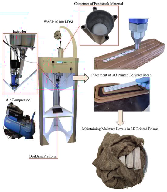 After the printing process, the specimens were maintained in a humid environment. To achieve a humid environment and prevent cracking, the specimens were wrapped in wet burlap after three days and stored at room temperature (20 ± 2 °C) with 95% relative humidity. Figure 5 displays the WASP LDM 3D printer, the printing process, and the maintenance of the printed prisms.