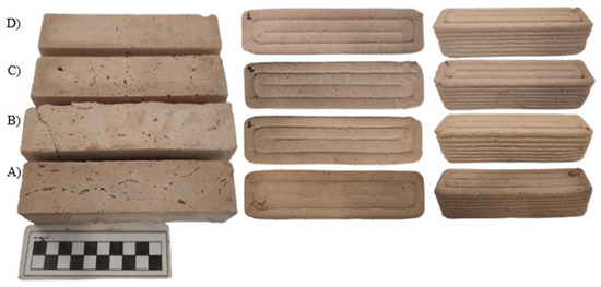 Final casted and 3D-printed prisms. (A) 100% Clay, (B) 95% Clay—5% Cement, (C) 90% Clay—10% Lime, (D) 80% Clay—20% Lime.