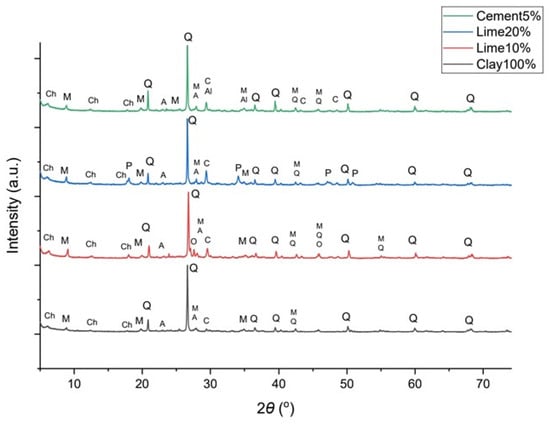 The crystalline phases identified in the clay-based samples after 28 days are presented in Figure 7.