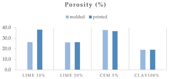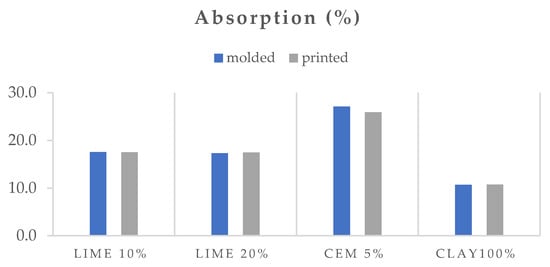 Figure 8, Figure 9 and Figure 10 show the open porosity (%), absorption (%), and specific gravity of the molded and printed specimens. In most cases, the open porosity appears similar between molded and printed specimens, with the exception of the lime 10% specimen, which exhibits a significant increase in porosity for the 3D-printed version. This can be attributed to the preparation methods. The molded lime 10% specimens were compacted using a vibration table according to EN 1015-11, which reduces air pockets and ensures a denser material. In contrast, the 3D-printed specimens did not undergo external compaction, resulting in higher porosity in the lime 10% due to trapped air during the printing process. The clay and cement specimens inherently settle and compact sufficiently during both molding and 3D printing. The specific gravity follows a similar trend, with lime at 20%, cement at 5%, and clay at 100%, showing minimal differences between molded and printed specimens. However, the printed lime 10% mortar has a noticeably higher specific gravity compared to its molded counterpart. Interestingly, the absorption remains consistent across all molded and printed specimens within each mortar series.