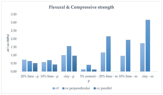 The effect of lime inclusion provided mixed results. Although it did not perform better than the clay mortars, it showed a more hopeful outcome. By examining the two percentages used, the 20% lime mortar displayed improved flexural strength compared to the 10% lime mortar. However, its compressive strength was less than the 10% lime mortar in the perpendicular to the printed layers direction. Conversely, the 20% lime mortar maintained better compressive strength in the direction parallel to the layers. The molded lime mortars showed a clearer trend: a higher percentage of lime resulted in enhanced mechanical properties.