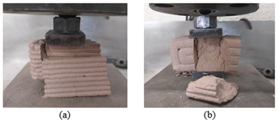 Due to the anisotropic properties of the 3D-printed mortars, the compressive strength was measured in both parallel and perpendicular directions, as illustrated in Figure 12.