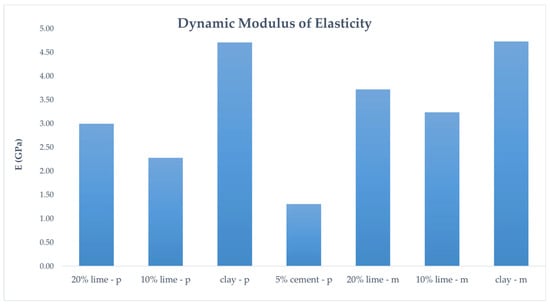 In Figure 13, the dynamic moduli of elasticity of the molded and printed specimens are depicted. Both printed and molded clay specimens show the same dynamic modulus, while the lime mortars show the same pattern, with the 20% lime mortar having a greater elastic modulus than the 10% lime mortar. The significantly lower dynamic modulus in the 5% cement mortar could be due to incomplete cement hydration. As discussed earlier, insufficient water might have hindered complete hydration, leading to a more porous microstructure (seen in Figure 8). In addition, there could be an incompatibility between the specific clay and cement, resulting in weak interfacial bonds and possibly some internal voids.